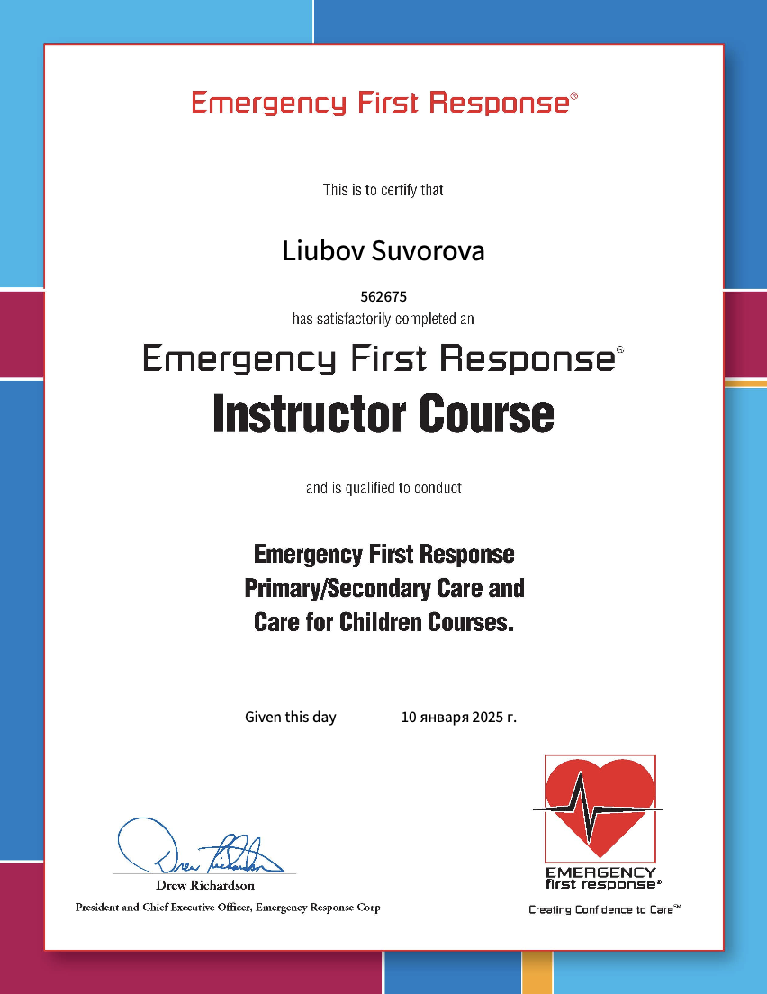 Олег имеет квалификацию инструктор-тренера EFR, что дает ему право проводить курсы подготовки будущих инструкторов EFR.