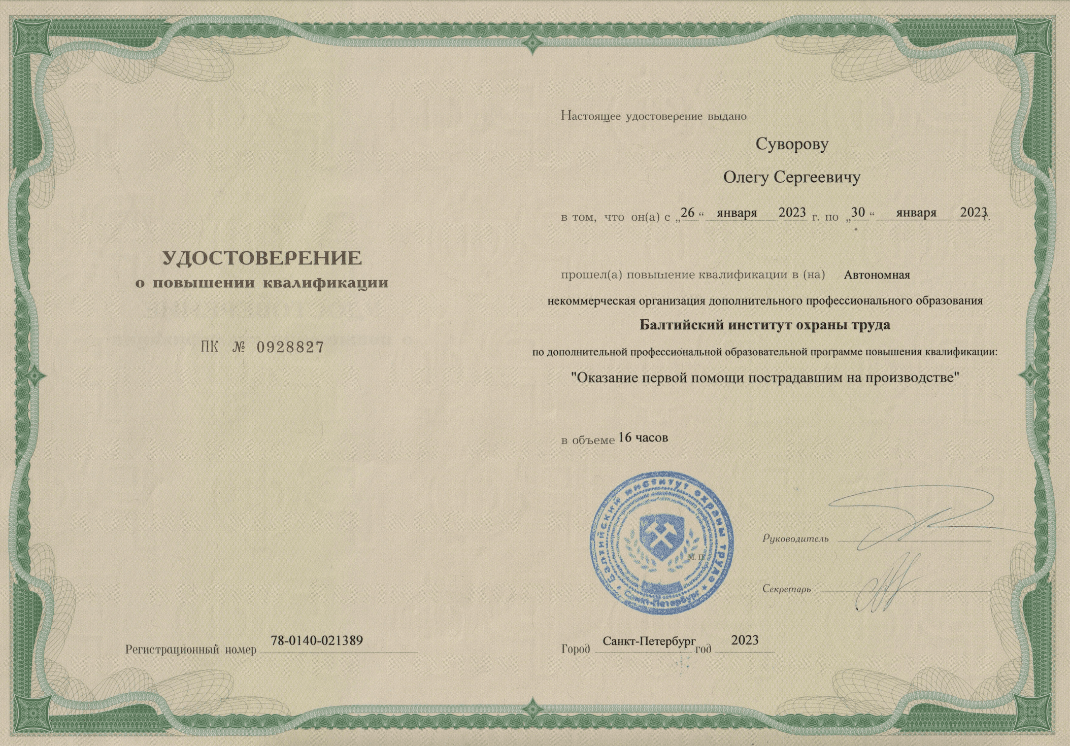 Олег обладает глубокими знаниями в области первой помощи, включая различные методики и техники оказания помощи при различных травмах и болезнях.